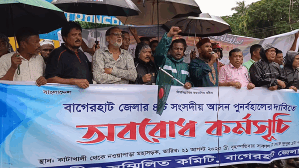 বাগেরহাট জেলা থেকে সংসদীয় ৪ টি আসনকে কেটে ৩ টি আসন করার প্রতিবাদে জেলার সর্বদলীয় সম্মিলিত কমিটি জেলায় অবরোধ, বিক্ষোভ মিছিল ও অবস্থান কর্মসূচী ঘোষনার প্রথম দিনে খুলনা-মংলা ও মাওয়া-খুলনা